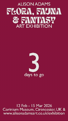 My month-long, solo 'Flora, Fauna & Fantasy' contemporary art exhibition at the Corinium Museum in Cirencester, England, and here, online, is currently on until the 15th March 2026. I am holding an opening on Saturday 14th February, 2026 to which you are invited and I aim to be there most Fridays and Saturdays. If you see any artwork online that is not in the exhibition I am happy to bring it in on those days for your perusal - just contact me.