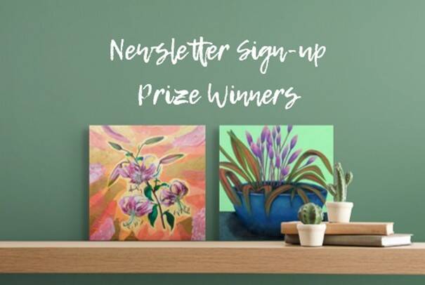 During my recent Flora, Fauna and Fantasy art exhibition, new subscribers to my newsletter had the chance to win a ‘Square Foot’ artwork through a raffle — one prize for those who signed up in person at the Corinium Museum, and another for those who subscribed online. I’m delighted to share that Lin, who entered online, is pictured below with her choice of Golden Bloom, while Lori, who visited the exhibition, selected Blue Bowl as shown below..