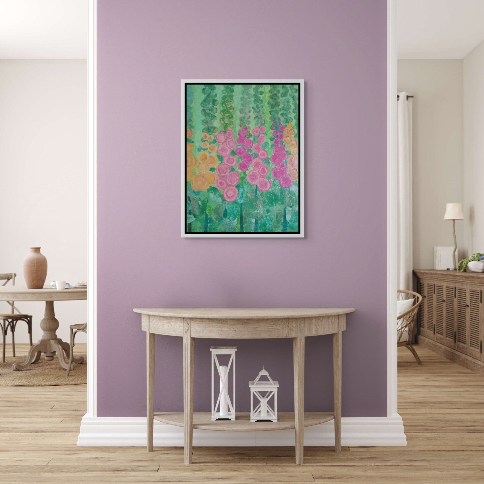 This colourful mixed media collage measures 80 cm tall by 60 cm wide (or 2 foot 8 inches tall by 2 foot wide). It pays homage to the glory of the proud hollyhock, with its striking pink and apricot tones set against lush green foliage. The vibrant hues and textured layers capture the bold elegance of the flower, celebrating its timeless beauty as it stands tall and proud amidst nature’s backdrop.