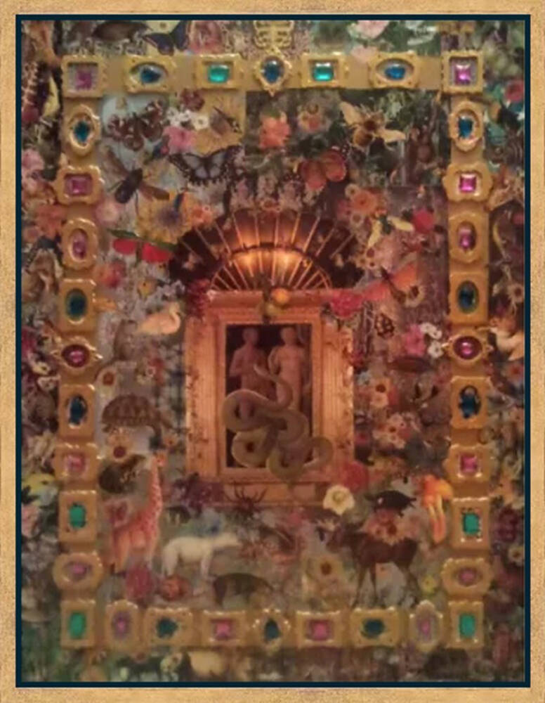 This imposing textured collage on stretched canvas measures 80 cm tall by 60 cm wide (or 2 foot 8 inches tall by 2 foot wide). It presents a lush, jewel-encrusted vision of paradise. At its heart, a naked Adam and Eve stand entwined with a serpent, framed in a golden window. Surrounding them bursts a kaleidoscope of creation: animals, insects, birds, and flowers in ecstatic abundance. This artwork was inspired by the rich and gilded art of Byzantium. The ornate jewelled border suggests both sacred opulence and human desire, blurring the line between innocence and temptation.
