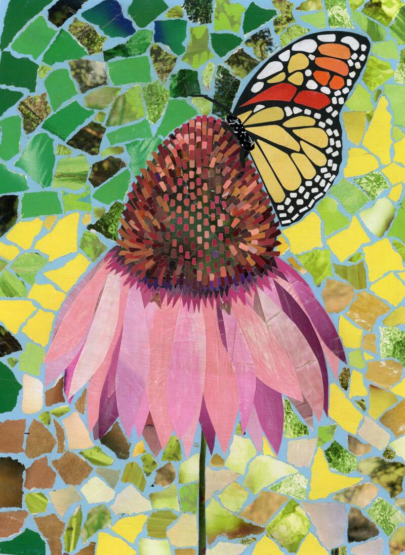 This colourful collage on cardboard which measures 40 cm tall by 30 cm wide (or 16 in tall by 12 inches wide) is presented with a white mount and white wooden frame measuring 54 cm tall by 43 cm wide (or 21 in tall by 17 in wide). It depicts .a stylised butterfly delicately alighting on a solitary echinacea flower, capturing a moment of stillness and natural beauty. The layered textures and vivid hues of collaged magazine paper bring the scene to life, celebrating the harmony between flora and fauna with a whimsical, handcrafted charm.