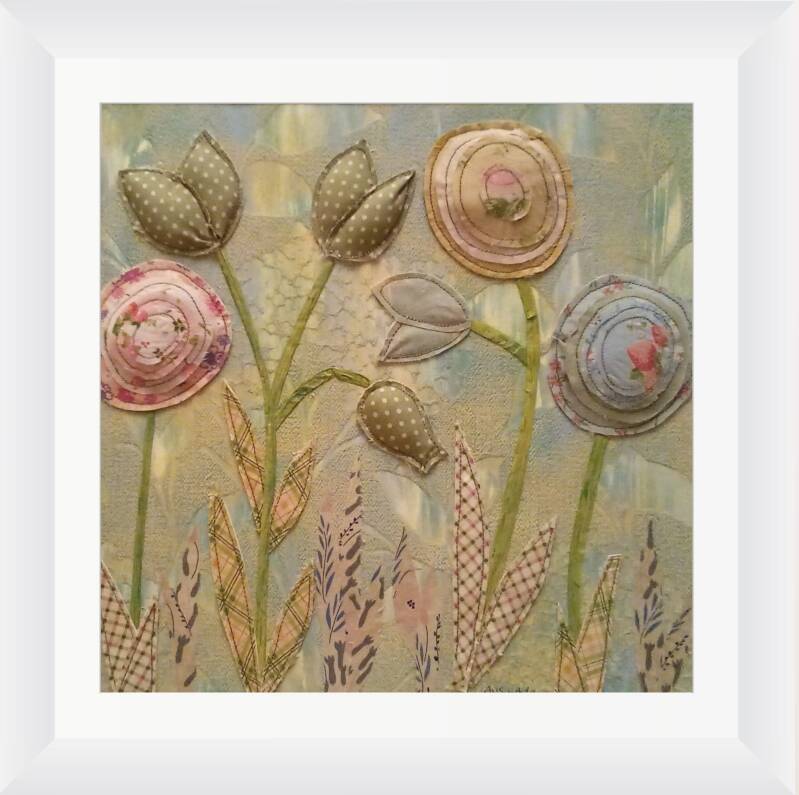 This collage on card which measures 35 cm tall by 35 cm wide (or 14 in tall by 14 in wide) is presented in a 45 by 45 cm (or 18 in square) white frame with an inner and outer white mount. Simple circular padded fabric flowers in muted tones take centre stage on a softly acrylic-painted card. The flowers, crafted from textured fabric, are stitched and padded to create a sense of depth and volume. The muted tones — soft blues, blushes, and beiges — contrast gently against the painted background, which adds a smooth, understated base. The minimalistic design focuses on the quiet beauty of each flower, allowing their gentle curves and fabric texture to evoke a sense of calm and simplicity.