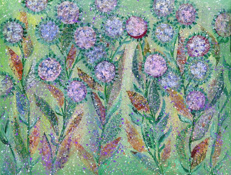 This lively mixed media collage on stretched canvas which measures 40 cm tall by 50 cm wide (or 16 in tall by 20 in wide) is supplied with a white wooden floating frame measuring 43 cm tall by 53 cm wide (or 17 in tall by 21 in wide). In it, cheerful flowerheads in vibrant blues and purples burst forth, their bold colours set against a lush, green foliage background. The flowers, with their dynamic shapes and vivid hues, seem to glow with energy, while the textured layers of the collage add depth and intrigue. The greenery behind them offers a sense of natural tranquility, providing a perfect contrast to the vivid blooms. The combination of mixed media elements creates a playful, multi-dimensional quality, inviting the viewer to engage with both the bright, joyful foreground and the intricate, layered backdrop.