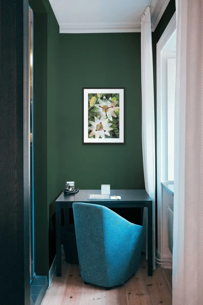 This bold collage on cardboard measures 40 cm tall by 30 cm wide (or 16 inches tall by 12 inches wide) is presented with a white mount and black wooden frame measuring 52 cm tall by 43 cm wide (or 16 inches tall by 12 inches wide). It depicts two striking white passionflowers which stand out against a backdrop of dark, dense foliage, creating a dramatic contrast that draws the eye. The intricate petals of the passionflowers, with their delicate textures and soft, radiant whites, are meticulously crafted, while the deep greens and shadows of the surrounding leaves enhance their vividness. The layered collage technique adds depth and dimension, making the flowers appear almost alive, as if they are unfolding before the viewer. This piece celebrates the beauty and complexity of this most exotic of domestic plants, bringing together light and dark in a striking visual composition that captures the mystery and allure of nature.