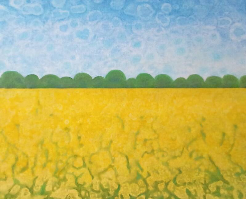 This stylised acrylic painting on stretched canvas which measures 40 cm tall by 50 cm wide (or 16 in tall by 20 in wide) is presented in a white stain floating frame, and depicts a bright yellow field of rapeseed in full bloom. The bold, expressive use of colour and simplified forms captures the striking vibrancy of the landscape, evoking the warmth and energy of a sunlit countryside scene in peak summer.. This artwork was created using the alcohol technique whereby alcohol is sprinkled into watery acrylic paint to create 'cells'. The outcome of this initial process suggested this subject to me.