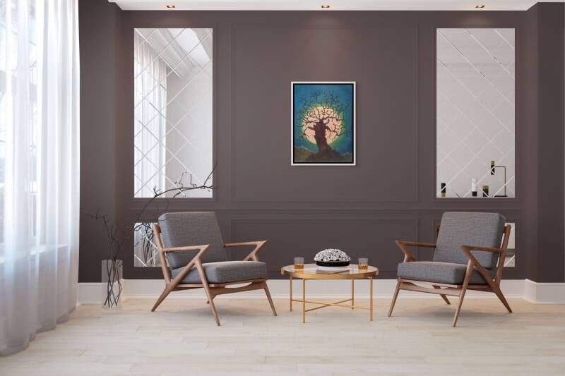 This striking acrylic painting on stretched canvas measures 80 cm tall by 60 cm wide (or 2 foot 8 inches tall by 2 foot wide).. It depicts a hauntingly beautiful scene. At its centre, a gnarled, leafless, twisted old tree looms in eerie silhouette against the glowing expanse of a full moon. The stark contrast and luminous backdrop create a spine-chilling yet mesmerising atmosphere, blending mystery with visual allure.