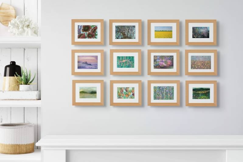 Entangled is also available as a blank mounted greeting card measuring 5 x 7 inches or 12.5 x 18 cm with the artwork being 4 x 6 in or 10 x 15 cm and comes with a white envelope. The mounted card can be framed in a 5 x 7 inch frame and may be grouped with other prints to create a gallery wall of small art pieces as shown below.