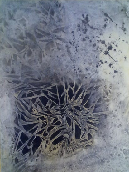 In this stylised abstract black and white print/acrylic painting/drawing on paper, the chaotic patterns of cracked sheet ice are captured with dynamic intensity. The intricate, jagged lines and sharp contrasts evoke the beauty and tension found in frozen landscapes, transforming nature’s raw force into a striking, abstract composition. This artwork started life as a print using heat-treated plastic/foil which then suggested this image to me. This was then worked with acrylic pens. The process is detailed in this video.
