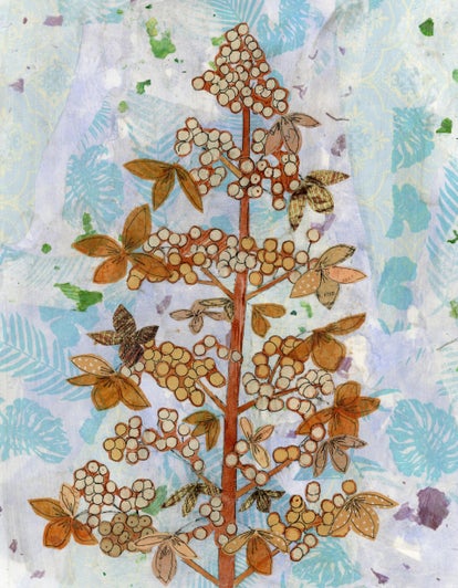 This mixed-media collage celebrates the quiet drama of nature’s late-season forms. Silhouettes of seedpods and leaves are cut from marbled papers, their midnight blues and luminous purples veined with coppery gold. Speckled textures suggest starlight or drifting pollen, giving the composition a dreamlike, cosmic energy. Interlacing stems create a graceful vertical rhythm, while the pale background lets the richly patterned foliage glow as though lit from within. The piece captures the moment when plants release their seeds, a meditation on growth, transformation, and the cycles of the natural world.