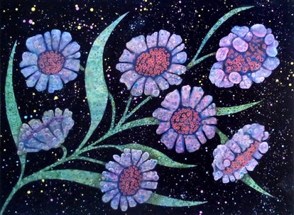 This vibrant painting depicts a cluster of stylised flowers floating against a deep, star-speckled background. The blossoms, rendered in shades of lavender and violet with textured, bubble-like petals, seem to radiate softly from reddish-pink centres. The stems and leaves are painted in cool greens, also covered in circular, cell-like patterns, giving them an otherworldly texture. The dark blue backdrop is dotted with colourful specks suggesting a cosmic or galactic setting. The overall effect merges botanical and cosmic imagery, evoking the feeling of flowers blooming in space or an alien garden.