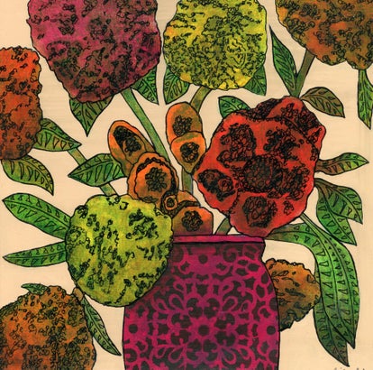 This colorful collage and acrylic painting on stretched canvas depicts a vibrant array of flowers and climbing plants in full bloom during the peak of summer. The lively composition is filled with rich hues and dynamic textures, capturing the abundant beauty and energy of the season as the blossoms reach their fullest expression.