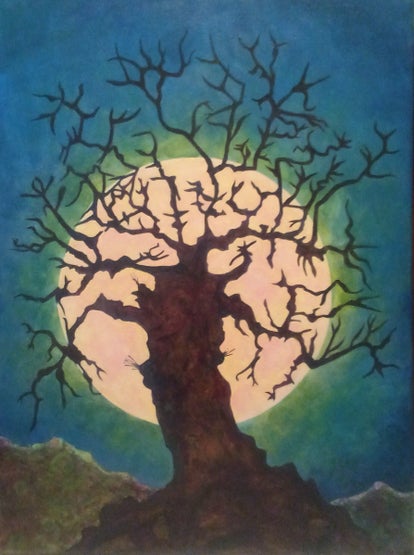 This striking acrylic painting, created on stretched canvas presents a hauntingly beautiful scene. At its centre, a gnarled, leafless, twisted old tree looms in eerie silhouette against the glowing expanse of a full moon. The stark contrast and luminous backdrop create a spine-chilling yet mesmerising atmosphere, blending mystery with visual allure.