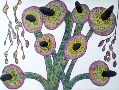 This acrylic painting on stretched canvas depicts a plant-like structure that resembles flowers or fungi but with a distinctly otherworldly quality. Each 'flowerhead' has a textured green and yellow centre surrounded by a soft pink-violet halo in the middle of which is a large black stamen. The disc-like 'flowers' emerge from intertwined, thick, green patterned stems which branch upward in an organic but geometric rhythm. On either side of the main cluster are delicate, trailing, tendril-like forms bearing small, seed-like pods, enhancing the sense of biological strangeness. The background’s clean white surface enhances the vivid contrast of the forms, while the purple outlines unify the composition with a rhythmic, almost cellular energy. In brief, plant-life but reimagined in a fantasy context.