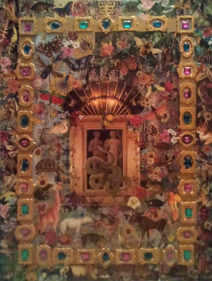This collage on stretched canvas is a lush, jewel-encrusted vision of paradise. At its heart, a naked Adam and Eve stand entwined with a serpent, framed in a golden window. Surrounding them bursts a kaleidoscope of creation: animals, insects, birds, and flowers in ecstatic abundance. This artwork was inspired by the rich and gilded art of Byzantium. The ornate jewelled border suggests both sacred opulence and human desire, blurring the line between innocence and temptation.