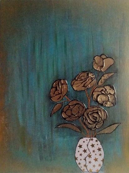 This textured mixed media collage on canvas board presents an abstract still life featuring golden roses set against a blue/green background. The rich textures and warm metallic hues of the roses create a striking contrast with the cool, serene backdrop, offering a dynamic interplay of colour, form, and depth in this evocative composition.