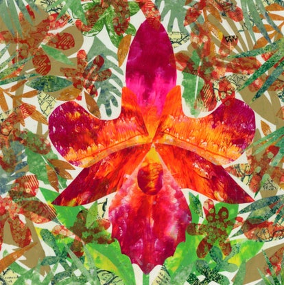 This collage on stretched canvas features a vibrant hot pink and orange orchid taking centre stage amidst lush tropical foliage and flowers. The bold, eye-catching orchid contrasts beautifully with the surrounding greenery, creating a dynamic and colourful composition that evokes the lushness and vitality of a tropical paradise.