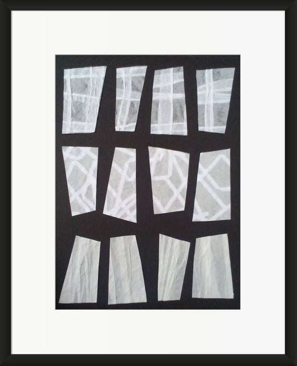 In this collage on card, textured vertical white trapezoids stand out sharply against a deep black background. The composition explores contrast and symmetry, with the tactile surfaces of the trapezoids adding a sculptural quality to the bold, minimalist design. Also available is the complementary Black Trapezoids as shown.