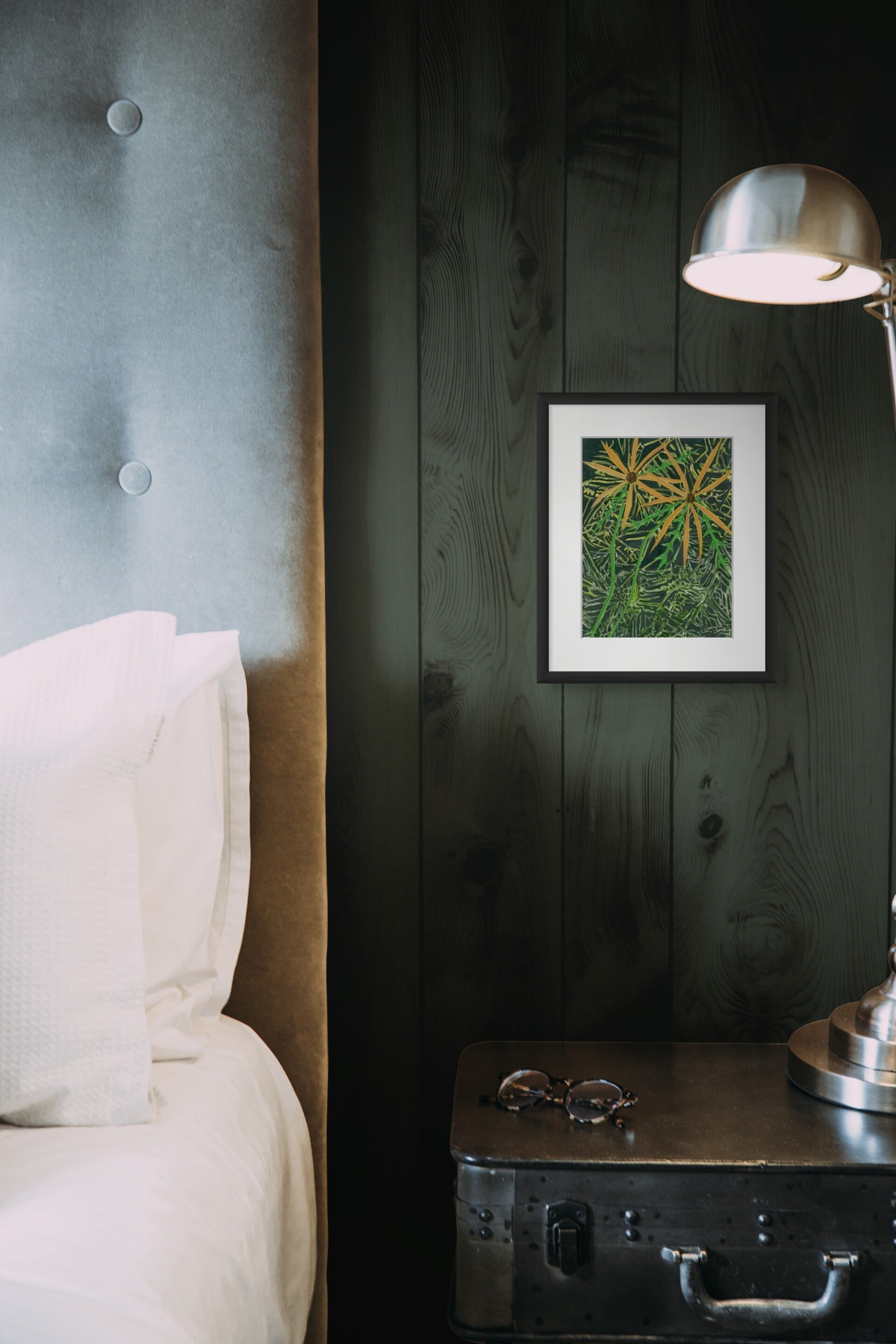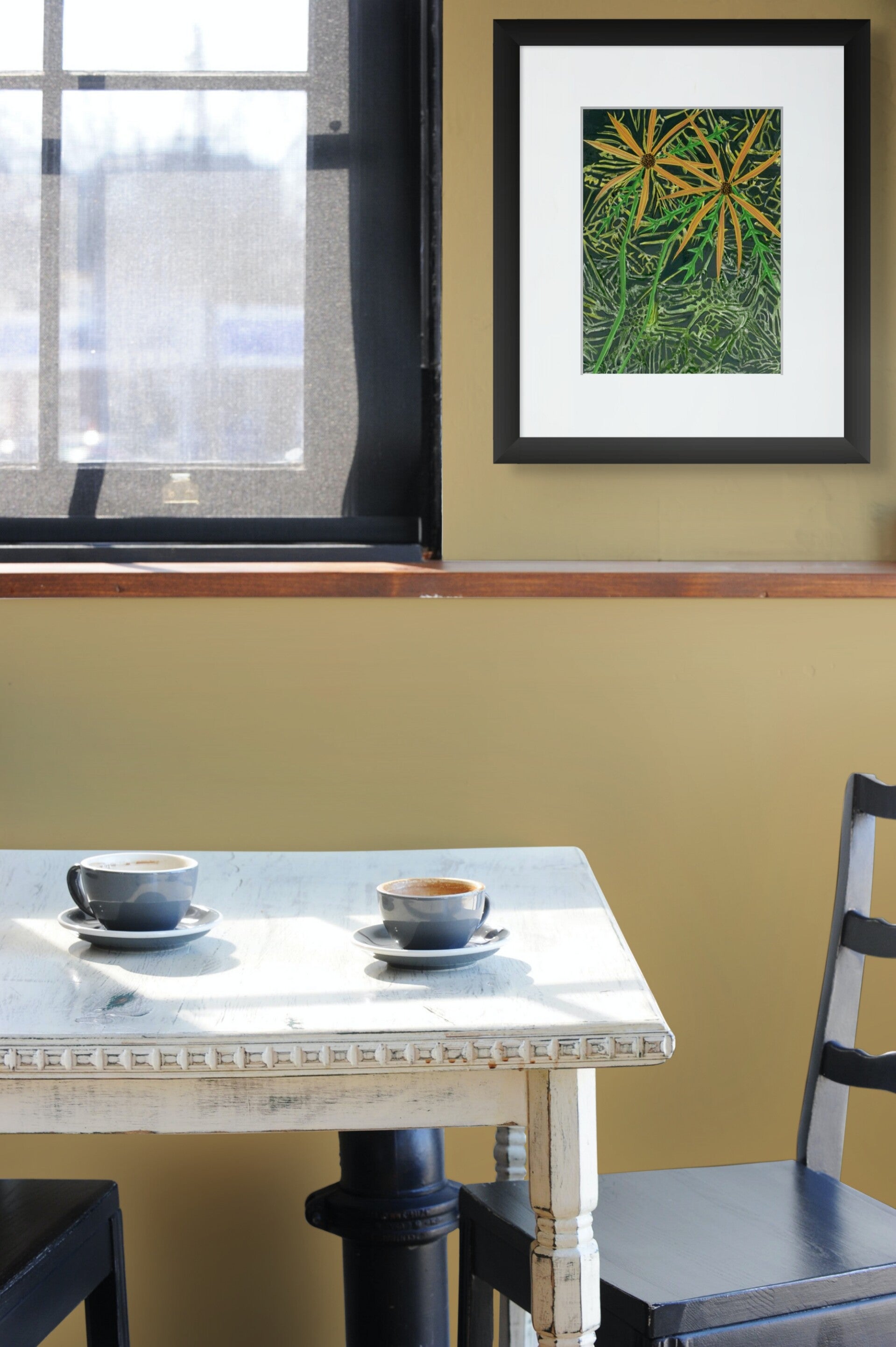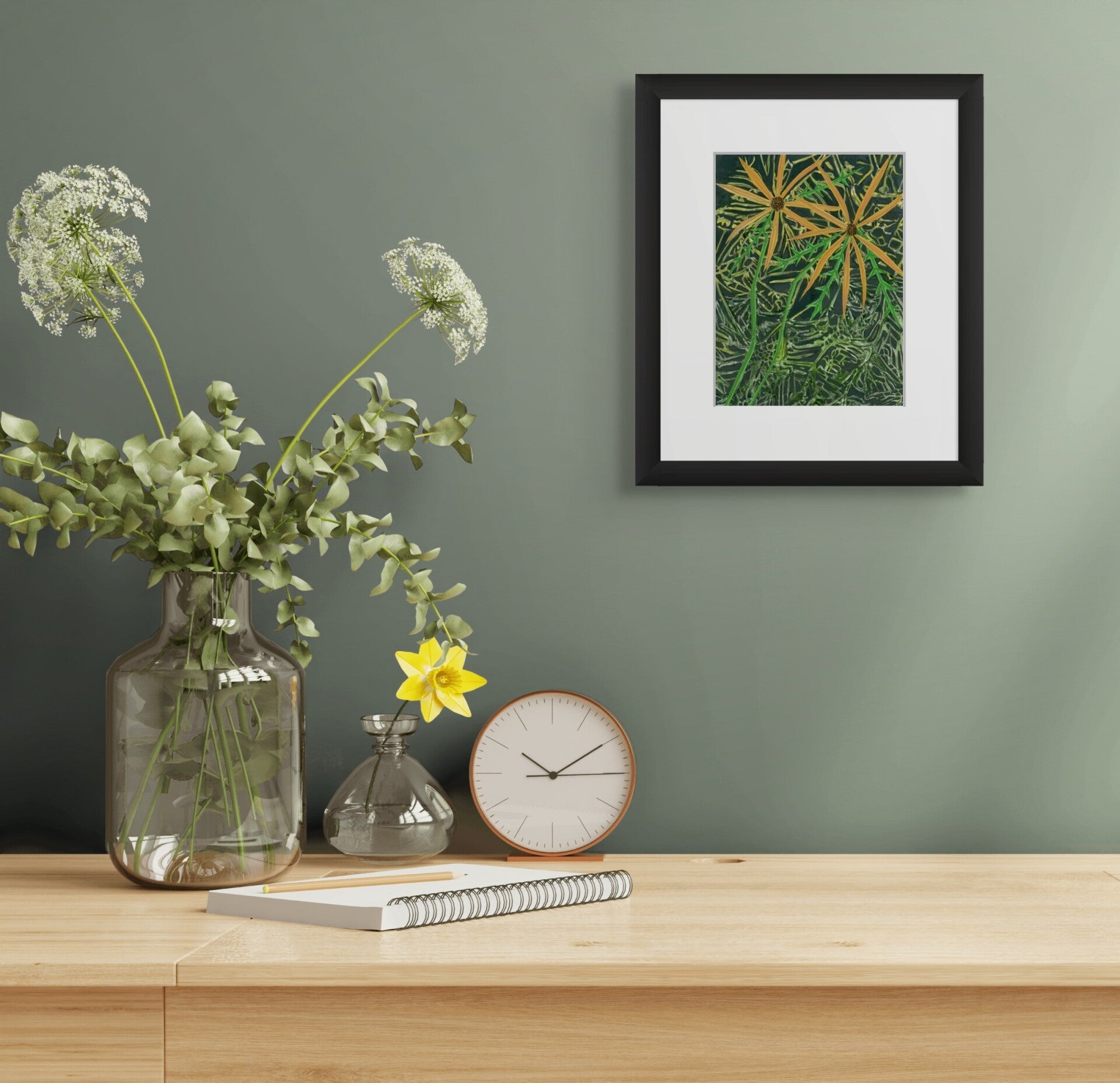 In this collage/print/acrylic drawing on paper, spiked orange flowers stand out against a complex, abstract pattern of green foliage. The bold contrast between the fiery orange blooms and the intricate, layered greens creates a dynamic interplay of colour and form, evoking a sense of vibrant, natural energy within a visually complex landscape. This artwork started life as a print using heat-treated plastic/foil which then suggested this image to me. It was further worked with acrylic pens and collage. The process is detailed in this video.