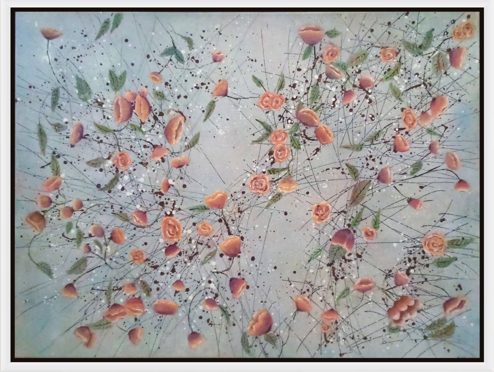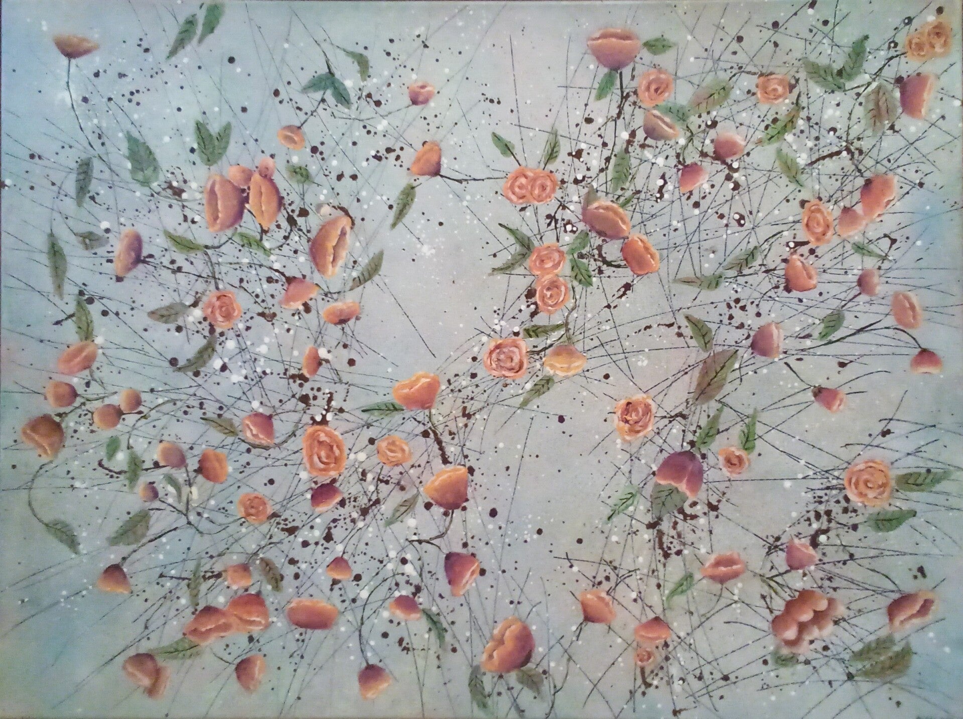 This delicate and subtly-coloured acrylic abstract on stretched canvas depicts scattered pink and purple rose buds and their green foliage blending gently across a grey background. The composition evokes a sense of fragility and quiet beauty, with each bud appearing as a fleeting moment in nature, inviting contemplation of the understated elegance of organic forms. This piece was produced using a technique whereby alcohol is sprinkled into a watery acrylic wash to produce 'cells' over a vibrantly coloured ground. The interesting effects produced are then preserved using masking fluid to create the 'rose buds' and a pale grey wash applied prior to removal of the masking medium. A video detailing the making of this artwork is available here.