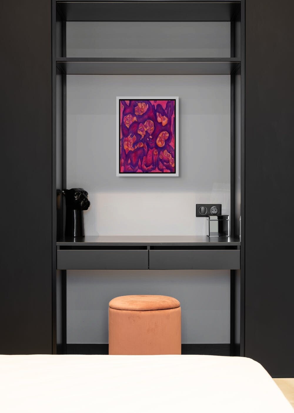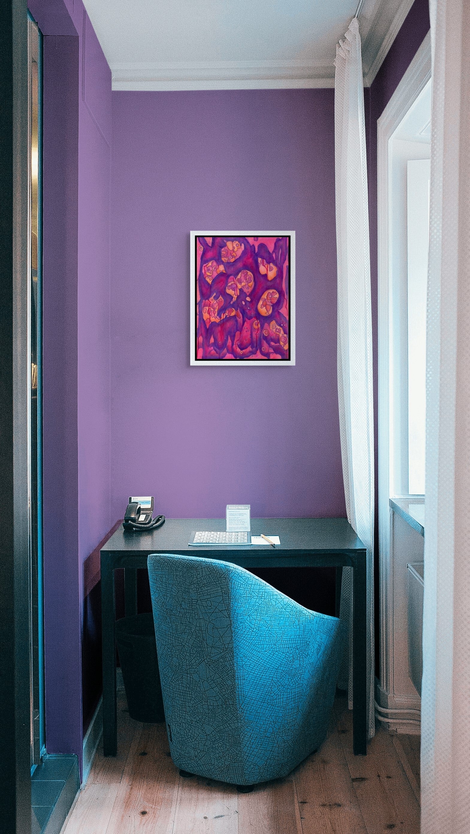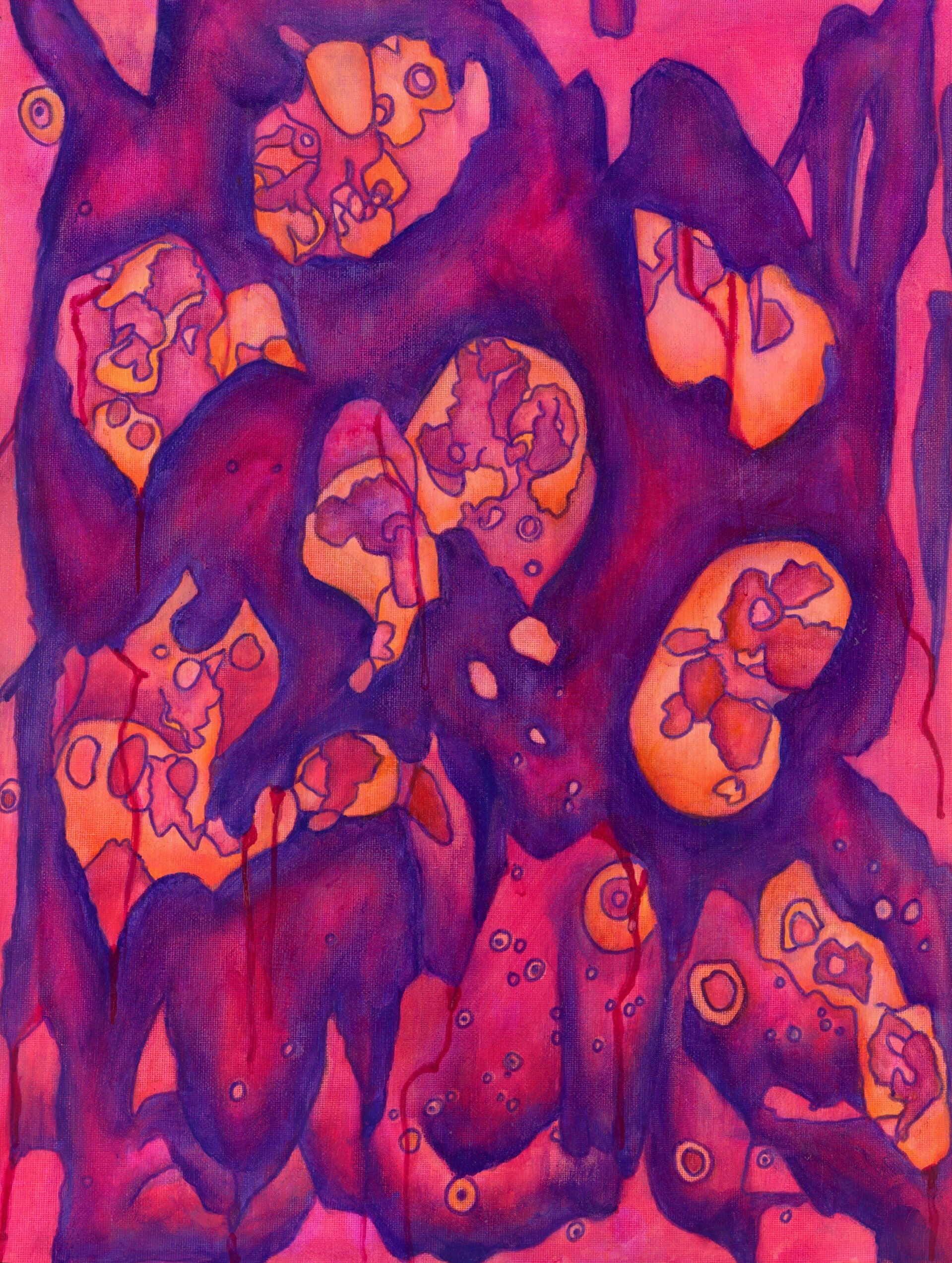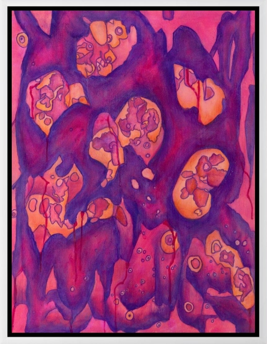 In 'Inside the Grotto,' a complex subterranean world is imagined in acrylic paint on stretched canvas. The painting explores the intricate caverns of underground landscapes, evoking the mystery and depth of a hidden, natural world beneath the surface - all in orange and purple!