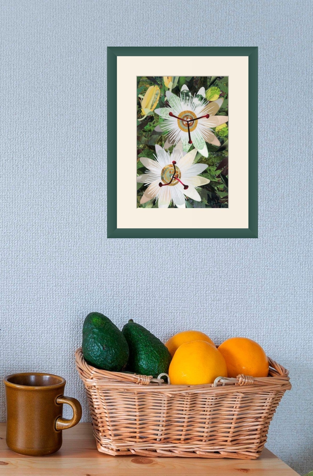 The original collage on cardboard depicts striking white passionflowers with dark foliage.