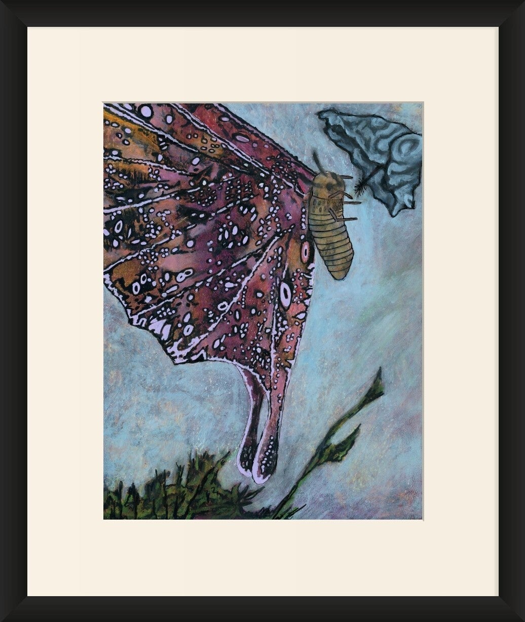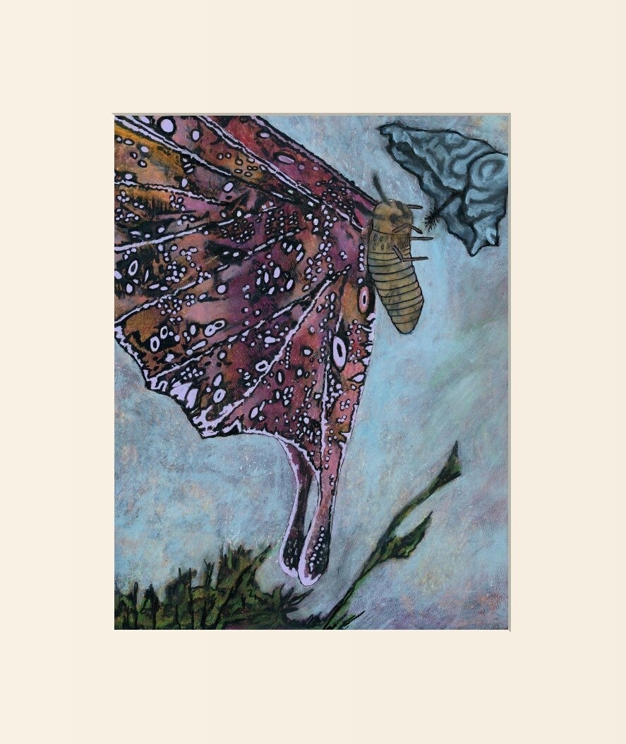 The original artwork is an acrylic painting on paper depicting a fantastical moth approaching a fantastical flower.