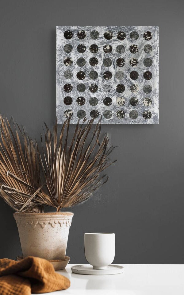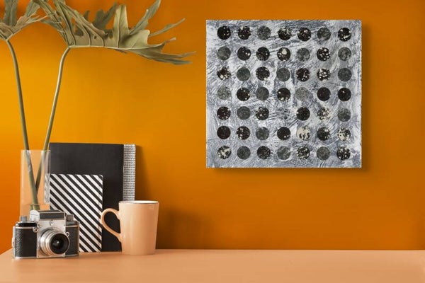This acrylic painting and collage on stretched canvas features mottled black dots against a lively white and grey background. The dynamic contrast between the dots and the energetic backdrop creates a sense of movement and texture, inviting the viewer to explore the intricate balance between the bold simplicity of the black dots and the vibrant chaos of the background.