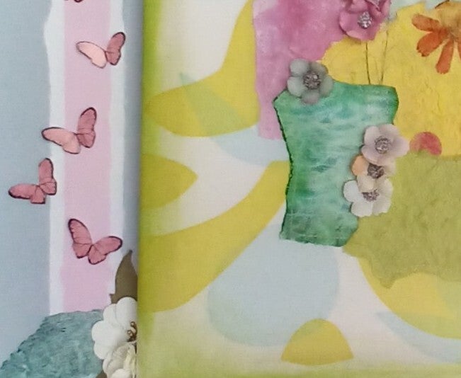 This pastel sewn abstract paper collage on stretched printed cotton celebrates all things spring. Presented in a deep white frame with an ornamented grey card mount, the piece blends soft, delicate hues and intricate stitching to evoke the freshness and renewal of the season, creating a hope-filled and uplifting atmosphere.