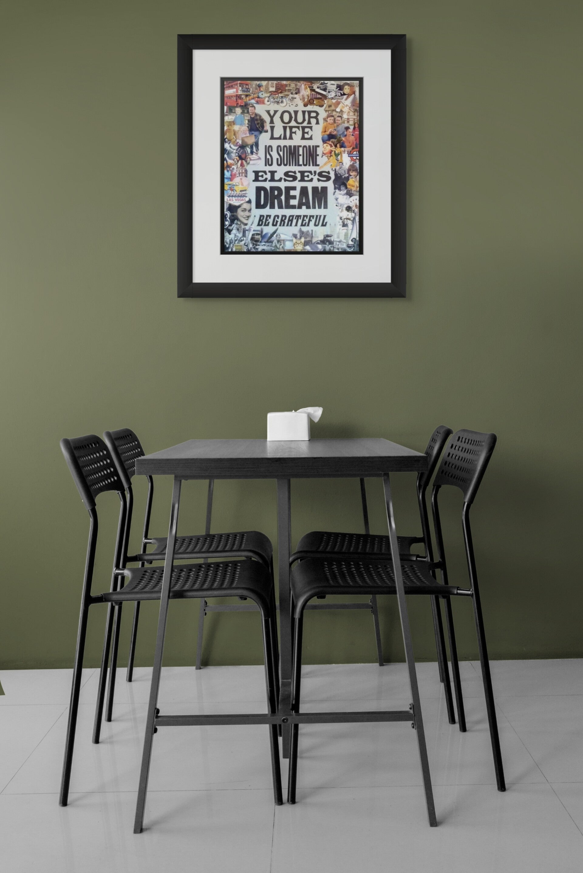 This striking mixed-media piece centres on a powerful typographic command: “Your life is someone else’s dream. Be grateful.” — set in bold, black letterpress type that dominates the composition with solemn authority. The starkness of the text contrasts sharply with its vibrant surroundings: a sprawling, chaotic collage of 1950s Americana. Cutouts of pin-up girls, chrome-trimmed cars, space travel, and smiling nuclear families form a nostalgic halo around the statement, creating a layered, ironic dialogue between idealised past and present introspection. The work juxtaposes the glossy optimism of postwar consumer culture with a confrontational reminder of privilege and perspective. Through this collision of media and message, the piece invites reflection on the dissonance between personal dissatisfaction and historical prosperity, urging a reconsideration of what it means to have enough.