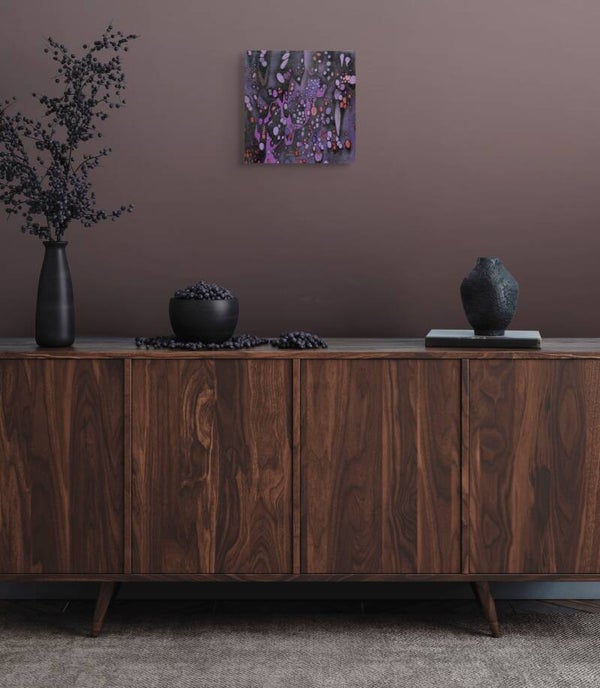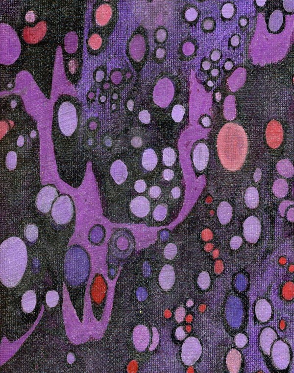 Chromatic Cascade is an abstract painting on stretched canvas that evokes a sense of moody dynamism and rich, tactile depth. Set against a deep black background, rivulets of metallic purple, burgundy, and plum cascade creating sinuous trails. Amid the fluidity, bubbles of colour rise and punctuate the surface. A thin coat of glitter varnish adds a final subtle shimmer (not evident in the photos!). The overall effect is at once lush and sombre, a chromatic descent into depth, memory, or a dream.