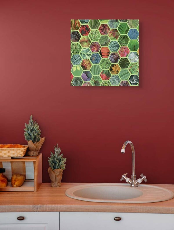 Verdant Hive is a vibrant collage that celebrates the geometric beauty of nature. Hexagonal cutouts of diverse foliage—ranging from delicate ferns to bold tropical leaves—are meticulously arranged in a honeycomb pattern across an iridescent lime green background. The shimmering surface shifts with the light, echoing the dynamic interplay of sun through leaves. Like cells in a living organism or a beehive in bloom, the piece pulses with organic energy and ordered elegance.