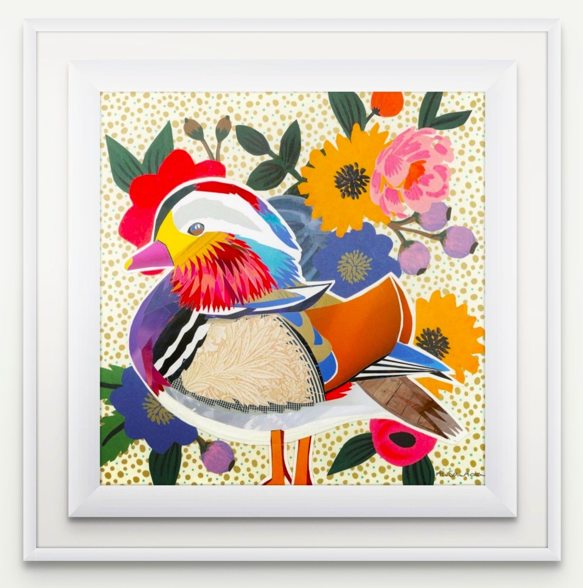 This cut paper collage on card is a dazzling celebration of colour, pattern, and texture, centered on one of nature’s most ornate birds - the Mandarin Duck. It is rendered in a mixed-media collage style that blends natural beauty with a highly stylised, almost abstract approach. Rich colours contrast with white, black, and blue accents across the bird's face and crest. The duck is set against a gold polka-dot background and surrounded by bright, oversized flowers and berries in vibrant colours. Elegant and exotic, the mandarin duck appears regal and poised. A paper festival of nature - this piece is alive with warmth and vibrancy and has companion artworks Floral Peacock and Floral Pheasant if desired as shown.