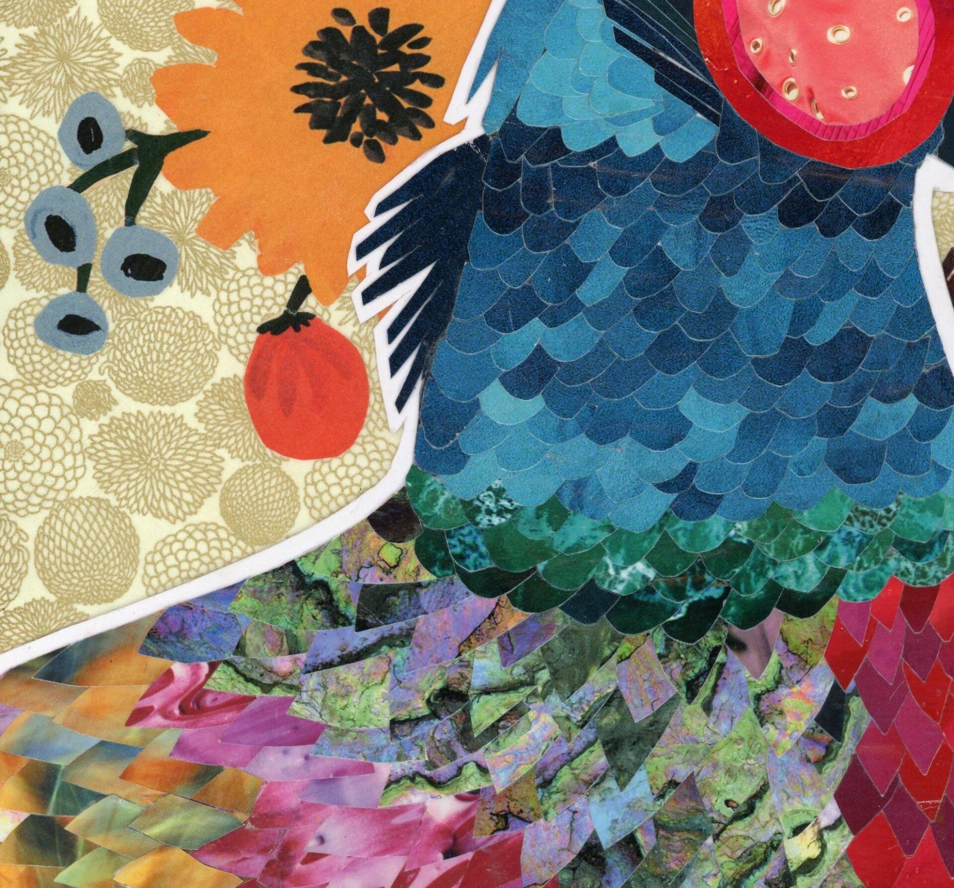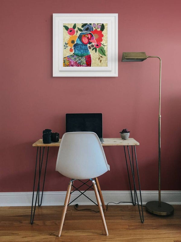 A stylised and vibrantly coloured pheasant is set against a bouquet of flowers and berries on a white and gold patterned background in this cut paper collage on card. The pheasant has been crafted from many overlapping collaged layers in colours ranging from yellows and greens to reds and bright blues to create the feathers of one of nature's most fantastically colourful birds. Floral Pheasant has companion pieces Floral Mandarin Duck and Floral Peacock if desired as shown.