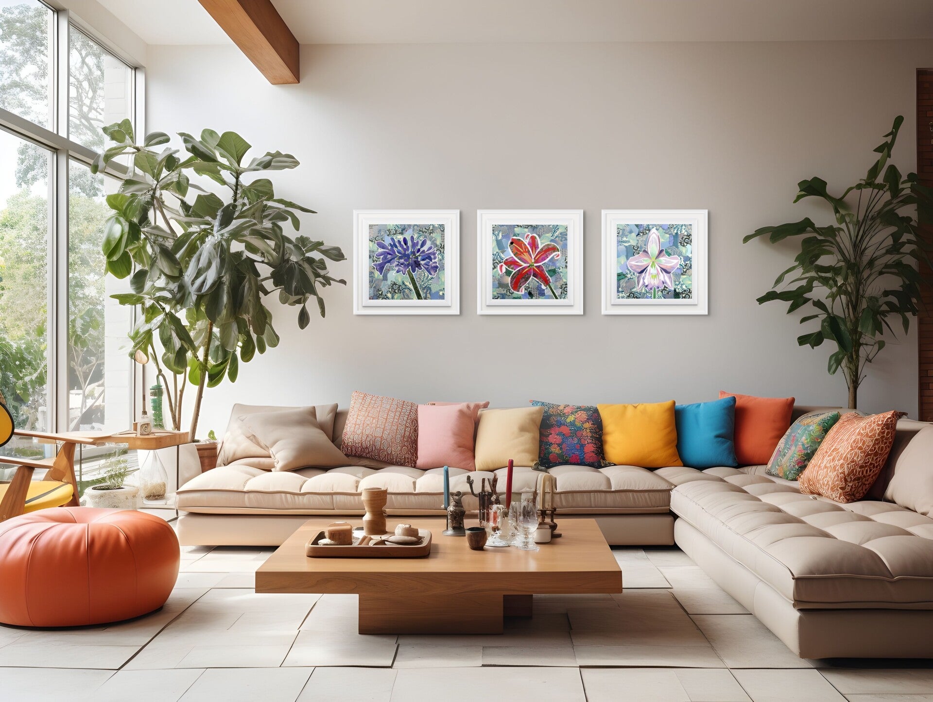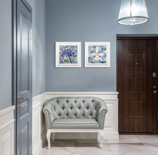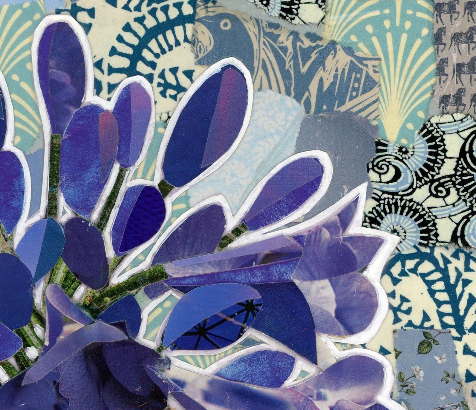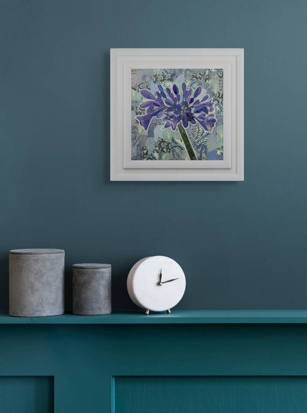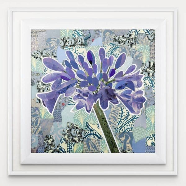 In this collage on card, the striking head of a blue agapanthus flower is set against a torn blue patterned paper background. The bloom is rendered in cut paper fragments in deep violet, lavender, cobalt, and blue-black hues. The individual buds and bell-shaped blossoms are stylised but clearly identifiable, each one created with a mix of solid, photographic, and patterned paper. White edging outlines the flower, giving it a cut-out or stencil-like clarity that makes it pop against the layered backdrop. This piece exudes a calm, almost regal quality - evoking both the grace of the agapanthus bloom and the rich cultural tapestry of its background. This artwork has companion artworks Red Lily and White Orchid if desired as shown (collectively 'Petals in Blue').