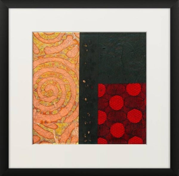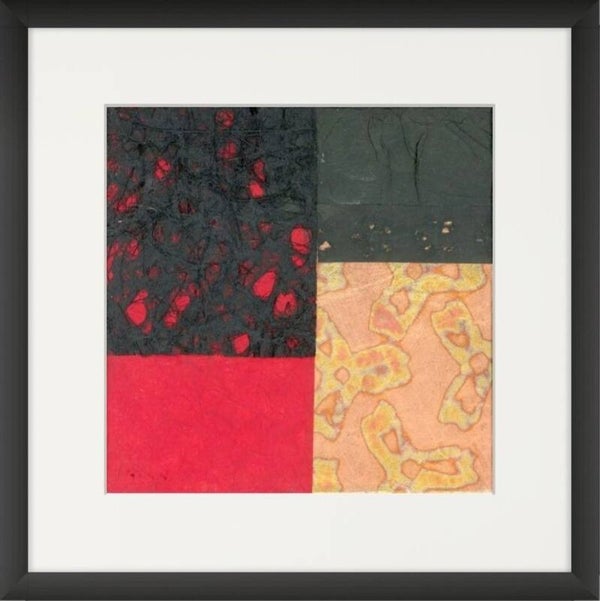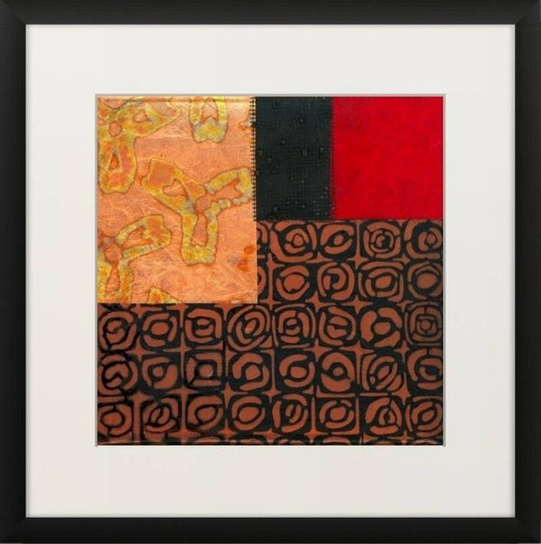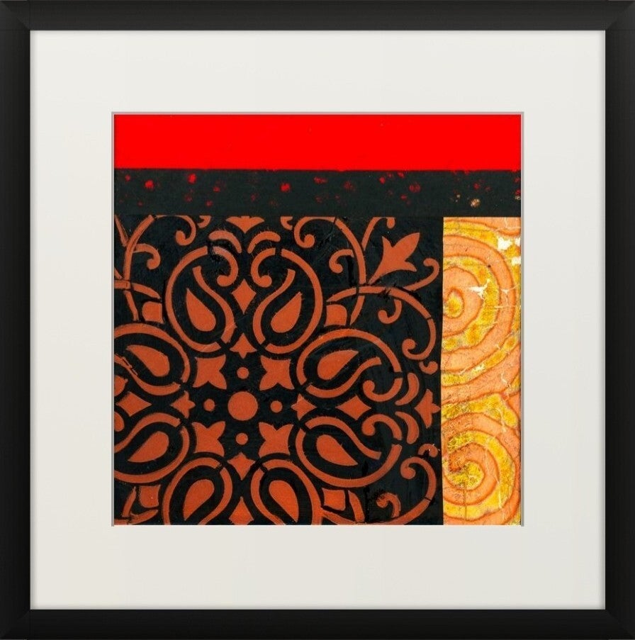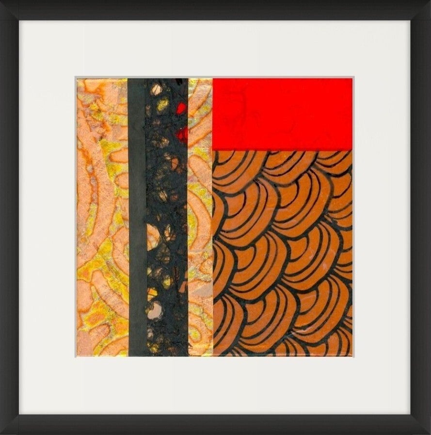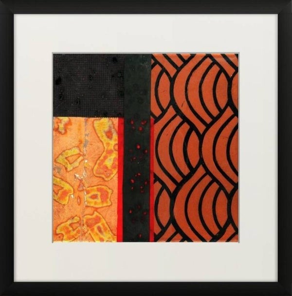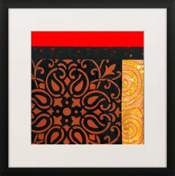 Encoded in Copper is a captivating series of six abstract collages, mounted on a stretched canvas on a white mountboard and framed in minimalist black shadow boxes that enhance their rich textures and vibrant colours. This cohesive set plays with geometry, pattern, and an evocative palette dominated by deep reds, burnished coppers, and inky blacks. The overall composition suggests a dialogue between tradition and modernity, structure and spontaneity. The 'copper' in the title evokes both the literal warmth of copper hues and the conceptual layering of codes, culture, and craftsmanship embedded within each composition. The series feels like a modern-day relic — archaeological yet contemporary — pulling from a range of cultural aesthetics. Together, these six works form a balanced grid that invites the viewer to explore detail and pattern, encouraging close observation while standing strong as a unified statement from afar.