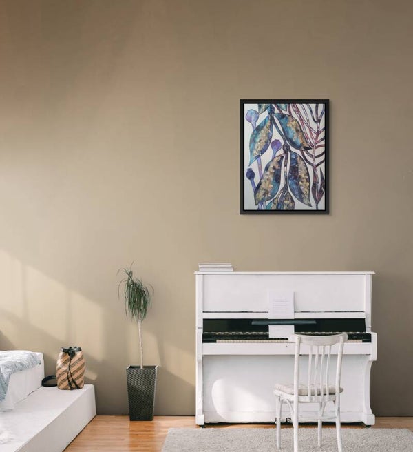 This mixed-media collage celebrates the quiet drama of nature’s late-season forms. Silhouettes of seedpods and leaves are cut from marbled papers, their midnight blues and luminous purples veined with coppery gold. Speckled textures suggest starlight or drifting pollen, giving the composition a dreamlike, cosmic energy. Interlacing stems create a graceful vertical rhythm, while the pale background lets the richly patterned foliage glow as though lit from within. The piece captures the moment when plants release their seeds, a meditation on growth, transformation, and the cycles of the natural world.