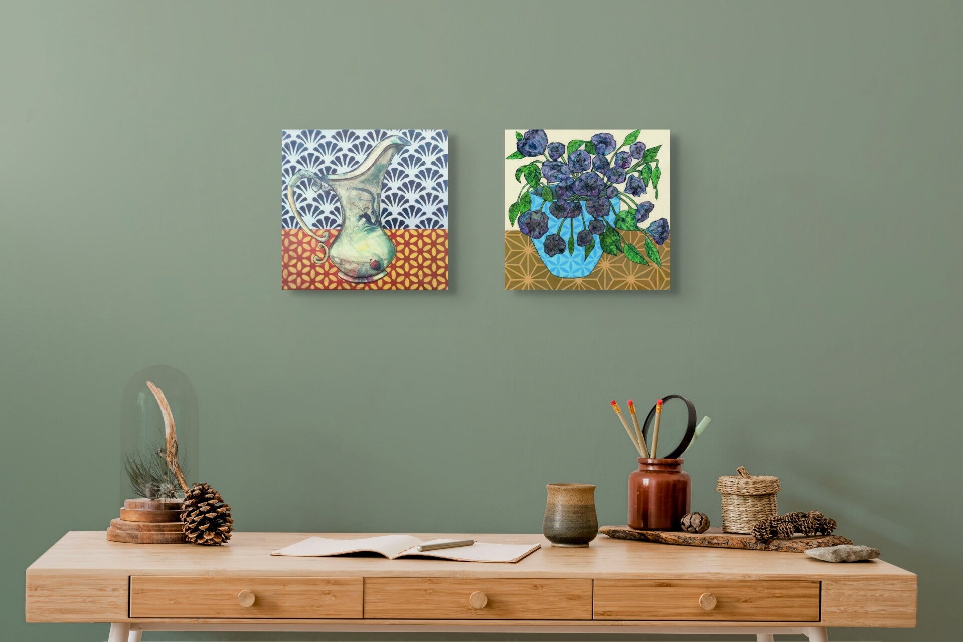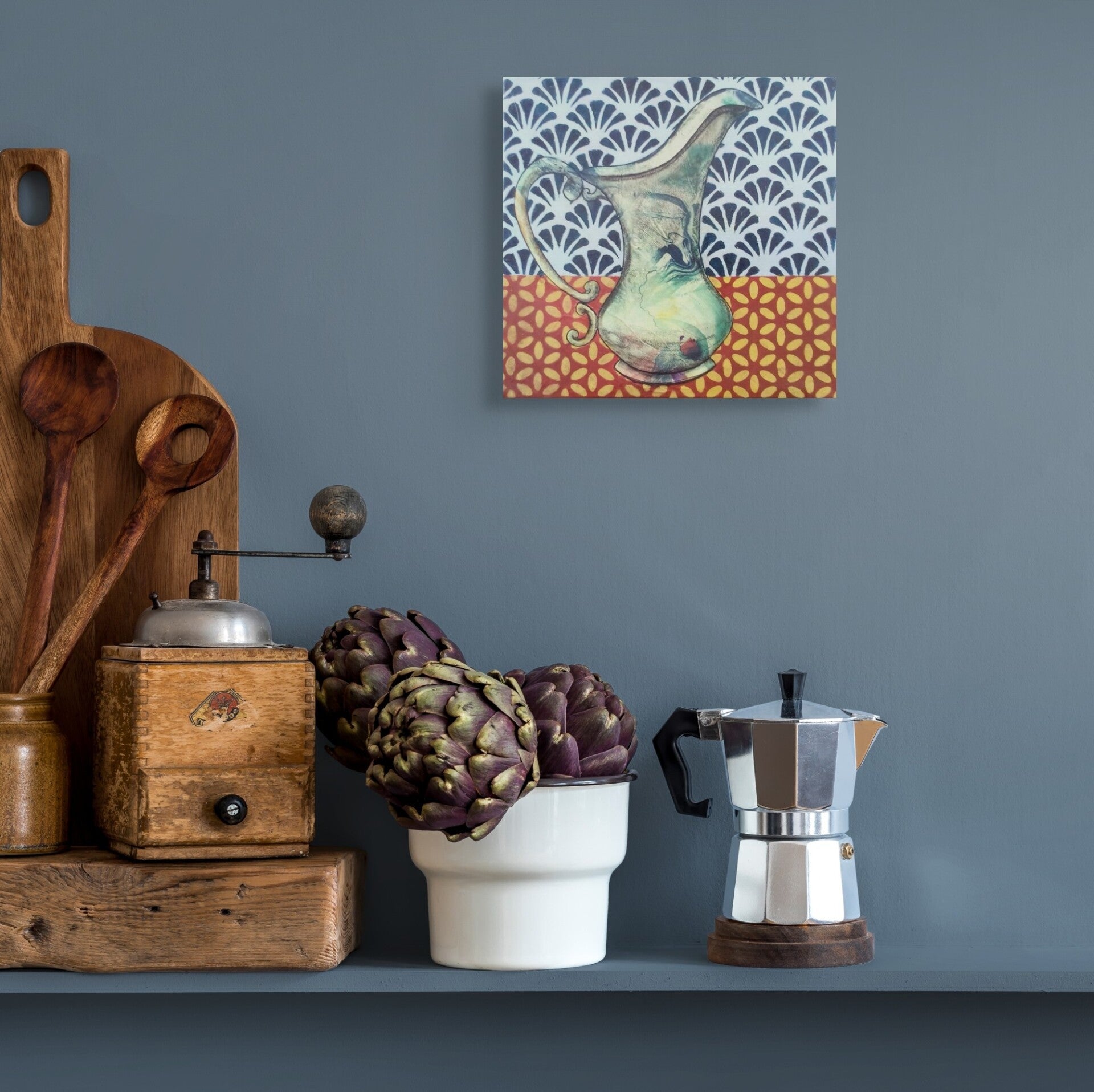 This artwork presents a decorative pitcher set against a bold, two-part patterned background. The pitcher itself is drawn with elegant, curving lines, its handle gracefully spiralling and its spout elongated. Its surface displays a marbled blend of soft greens, yellows, and subtle purples, creating the effect of weathered metal or patinated ceramic. The combination of the antique vessel and the striking, modern patterns behind it creates a dialogue between tradition and contemporary design, giving the image both a nostalgic and a vibrant, contemporary feel.