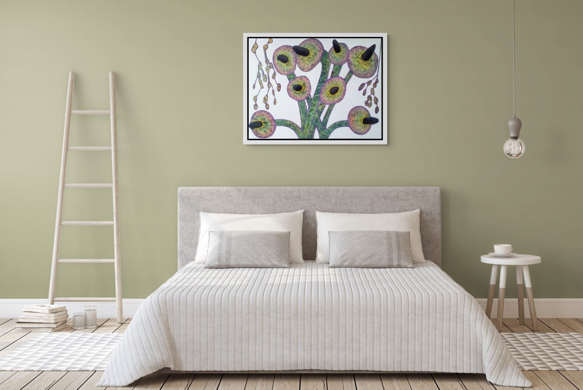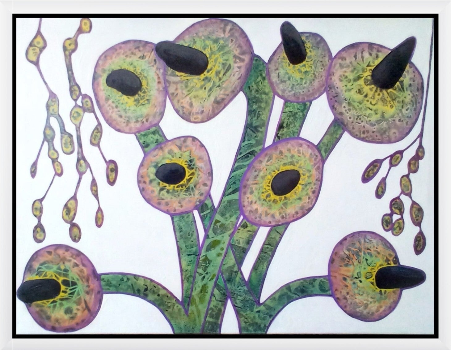 This acrylic painting on stretched canvas depicts a plant-like structure that resembles flowers or fungi but with a distinctly otherworldly quality. Each 'flowerhead' has a textured green and yellow centre surrounded by a soft pink-violet halo in the middle of which is a large black stamen. The disc-like 'flowers' emerge from intertwined, thick, green patterned stems which branch upward in an organic but geometric rhythm. On either side of the main cluster are delicate, trailing, tendril-like forms bearing small, seed-like pods, enhancing the sense of biological strangeness. The background’s clean white surface enhances the vivid contrast of the forms, while the purple outlines unify the composition with a rhythmic, almost cellular energy. In brief, plant-life but reimagined in a fantasy context.