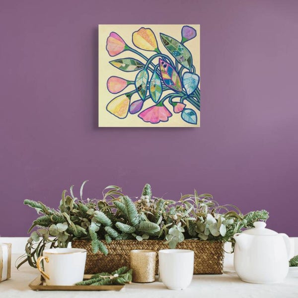 This artwork on stretched canvas depicts an abstract floral arrangement, blending painting and collage techniques. The flowers and leaves are outlined in bold, flowing blue lines that unify the composition. Each petal and leaf segment is filled with a mosaic of patterned paper in soft, pastel hues — pinks, yellows, greens, and blues — creating a stained-glass effect. The background is a pale yellow, allowing the vibrant colours to stand out. The overall style evokes both the delicacy of nature and the meticulous craftsmanship of quilting or stained glass art.