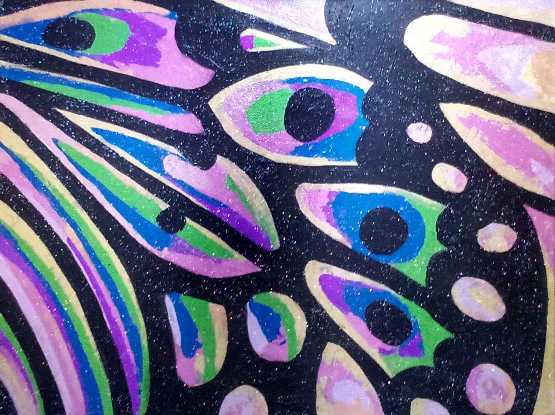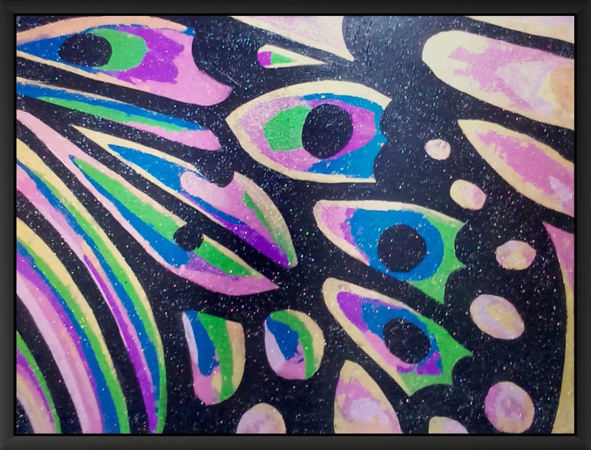 This vivid collage captures a close-up abstraction of a butterfly’s wing, crafted in shimmering metallic foils on stretched canvas. The overlapping layers of gold, violet, green, and blue create a dynamic interplay of colour and light, mimicking the natural iridescence of real butterfly scales. A sparkling, bold black outline frames each segment, giving the composition both structure and rhythm, while the reflective surfaces shift hues as light moves across them. This piece evokes the delicate beauty and mystery of transformation, motion, and the fleeting brilliance of nature’s design.