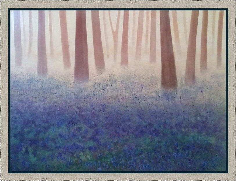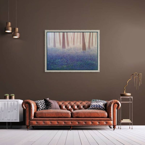 This evocative painting on stretched canvas captures the quiet enchantment of a woodland shrouded in morning mist. Tall, slender tree trunks rise like silent sentinels through a veil of soft, diffused light, their warm brown tones fading gently into the pale atmosphere. Beneath them, a carpet of delicate bluebells emerges through the haze, their cool violet hues mingling with the fresh greens of spring. The subtle transition from the misty, ethereal upper half to the vibrant, living forest floor creates a sense of depth and stillness — as though the forest itself is holding its breath at dawn.