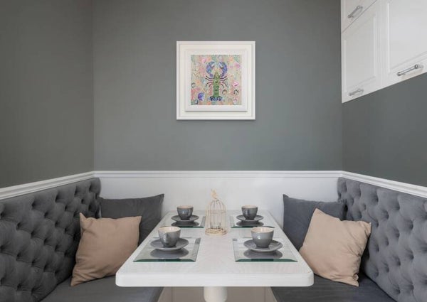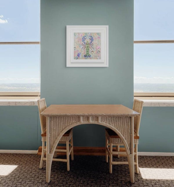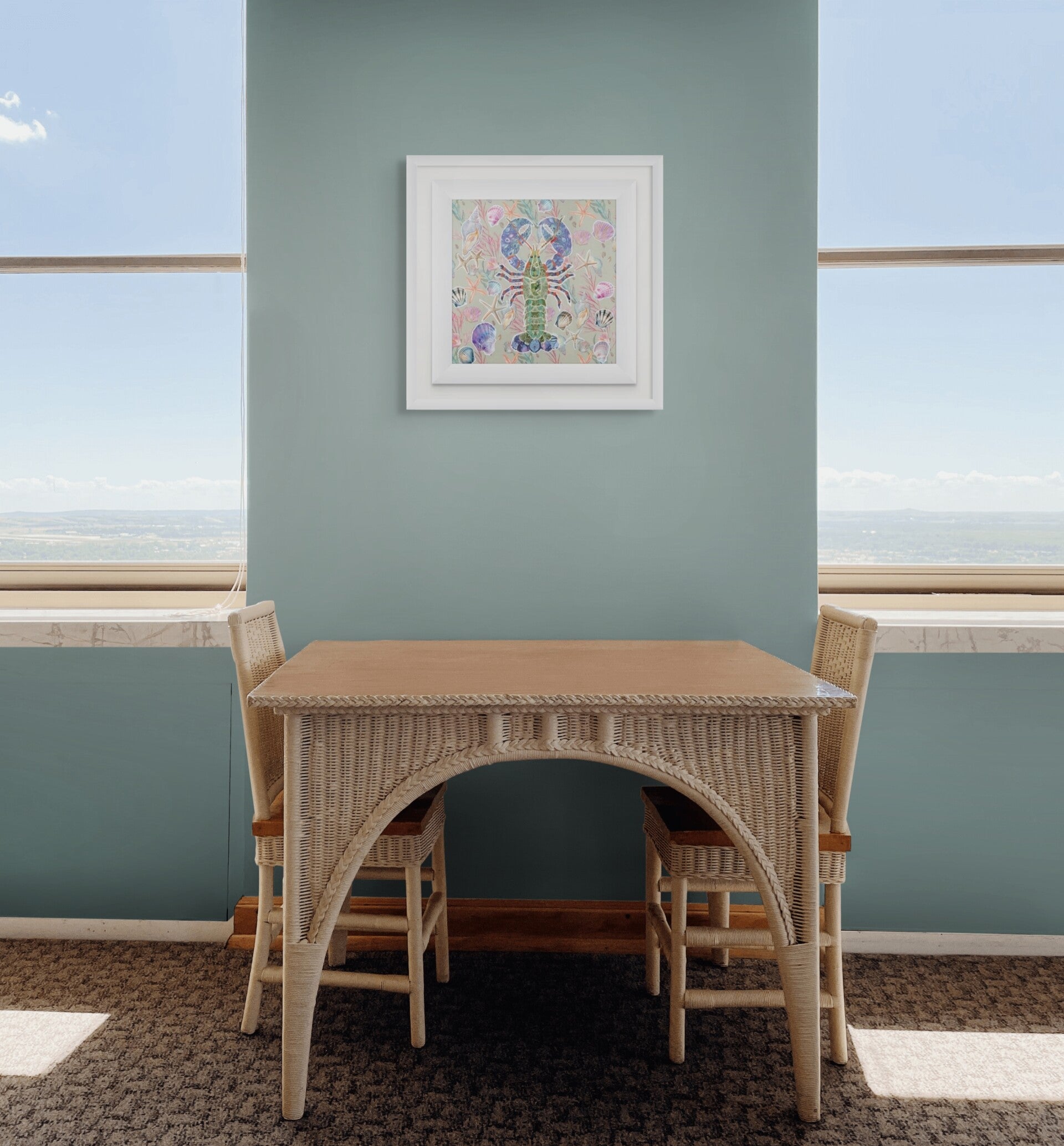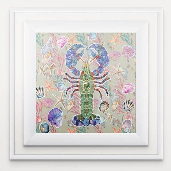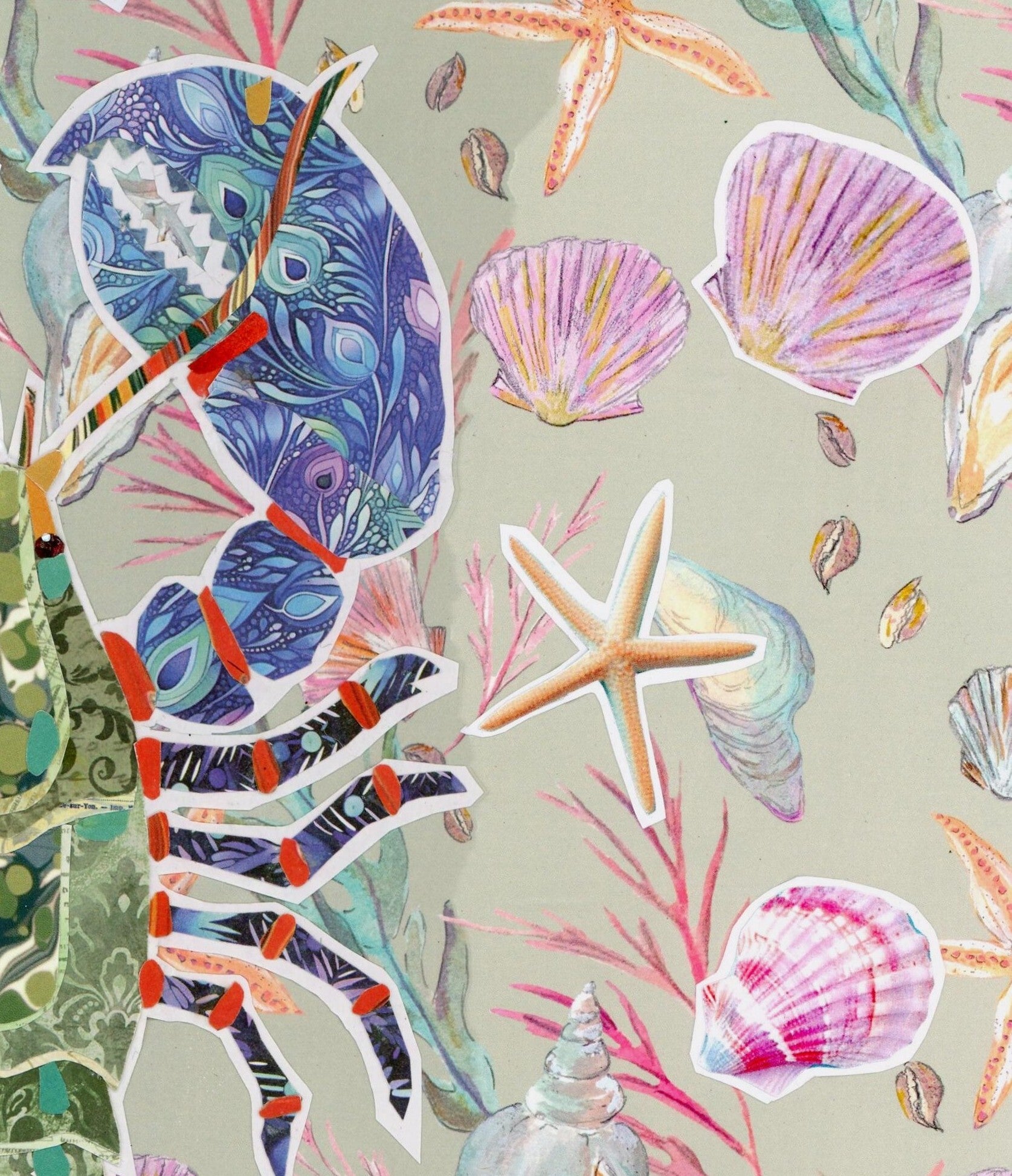 Set against a softly patterned aquatic backdrop adorned with shells, coral, and seaweed, the lobster appears to drift in a dreamlike underwater world. The harmonious blend of colour, texture, and pattern evokes both the rhythm of the sea and the meditative stillness of nature.