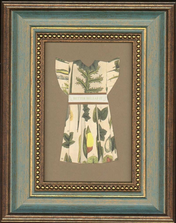This collection of six collages presented in gold and blue ornate European-style frames reimagines vintage illustrations of flora and fauna as couture silhouettes - merging the worlds of natural science and fashion design! Each dress is meticulously folded to create a refined harmony of texture, pattern, and form paired with a cheeky phrase that gives the piece personality. This collection celebrates the quirky intersection of puns, and paper fashion.