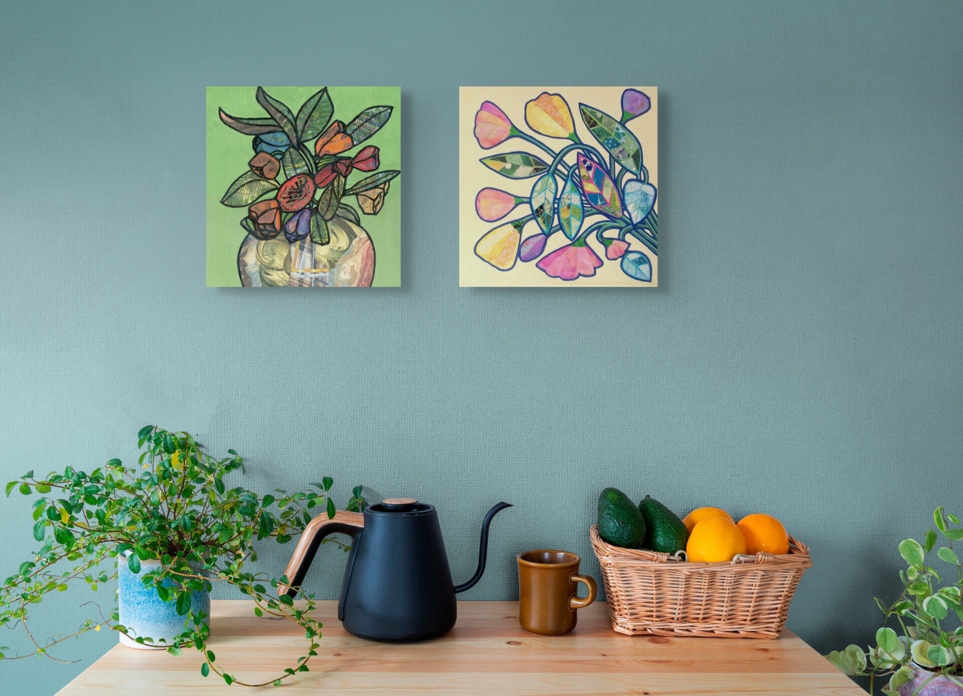 Set against a bright, flat green background, the bouquet pops forward as a vibrant, decorative composition. The piece blends painterly strokes with collage techniques, resulting in an expressive, handcrafted, and slightly abstract still life.