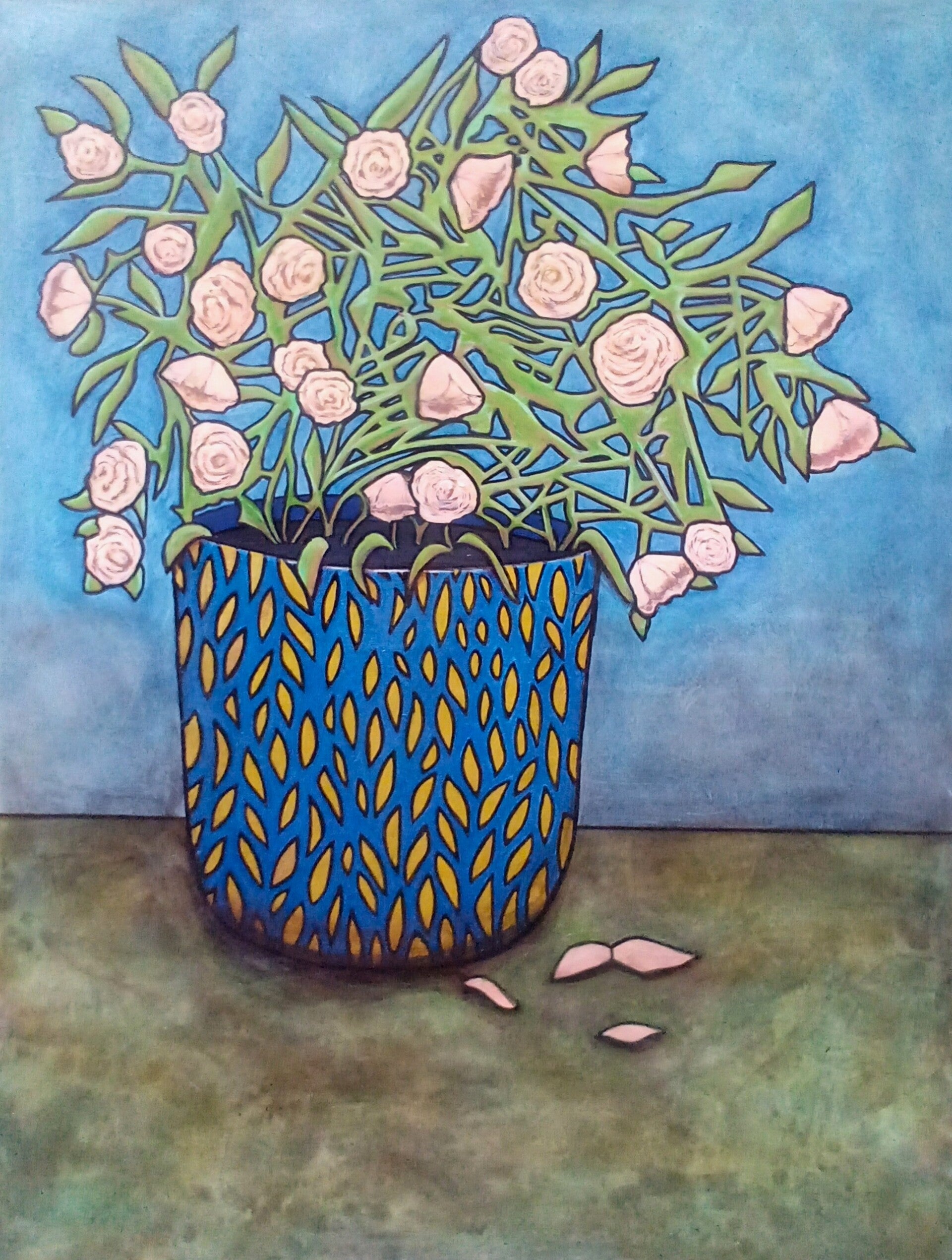 This painting presents a large bouquet of pale, rose-like flowers bursting out of a boldly patterned container. The pot features a rhythmic blue-and-gold leaf motif that draws the eye immediately. In contrast, the background is a softly blended blue, giving the impression of an airy, open space.