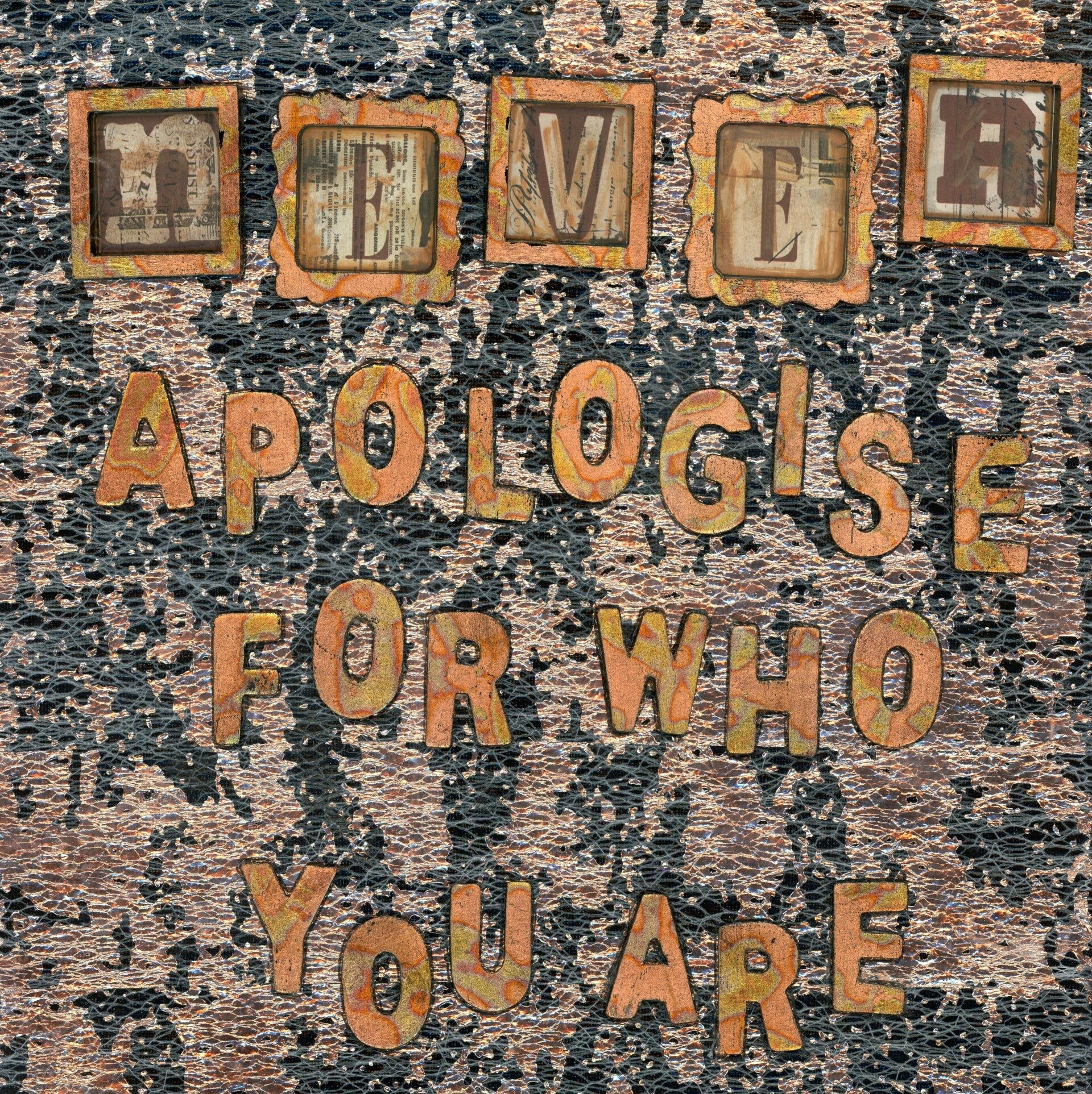 This mixed media collage on stretched canvas layers bold typography against a richly textured, distressed surface to deliver a clear, uncompromising message. Fragments of vintage text, worn colour, and metallic tones evoke resilience shaped by experience. The raised lettering asserts itself against the fractured background, suggesting identity forged through pressure rather than polished perfection. Never Apologise for Who You Are is both a declaration and an affirmation — celebrating authenticity, self-acceptance, and the quiet power of standing firmly in one’s truth.