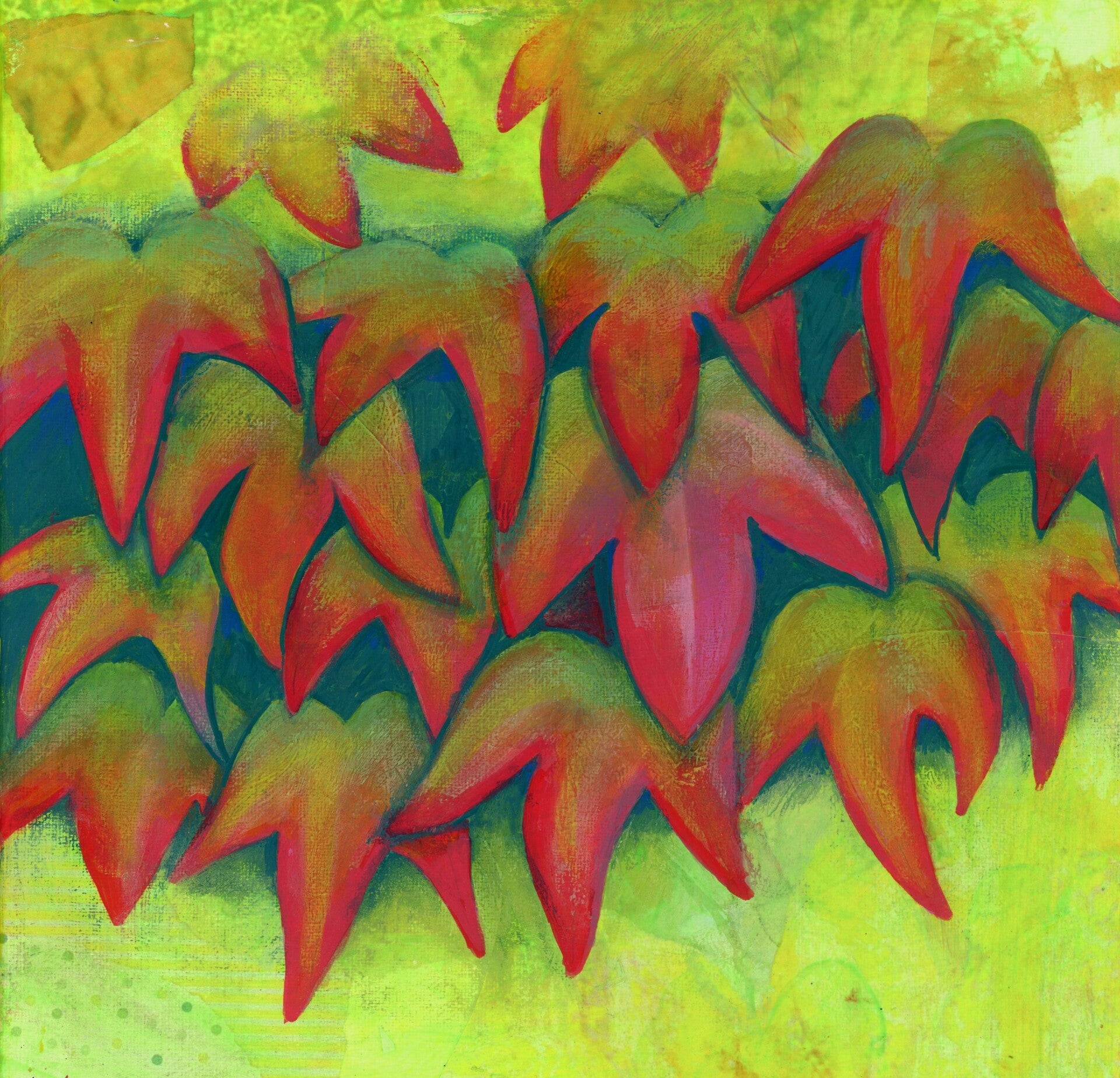 This mixed media collage artwork on stretched canvas captures the moment when summer turns its face toward autumn. A blaze of colour - crimson, three pointed leaves surge across a luminous field of yellow-green, evoking Virginia creeper at the height of its seasonal transformation. The composition feels both organic and rhythmic, balancing spontaneity with structure.