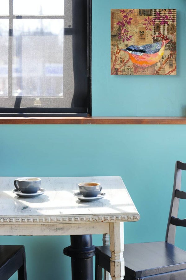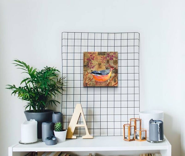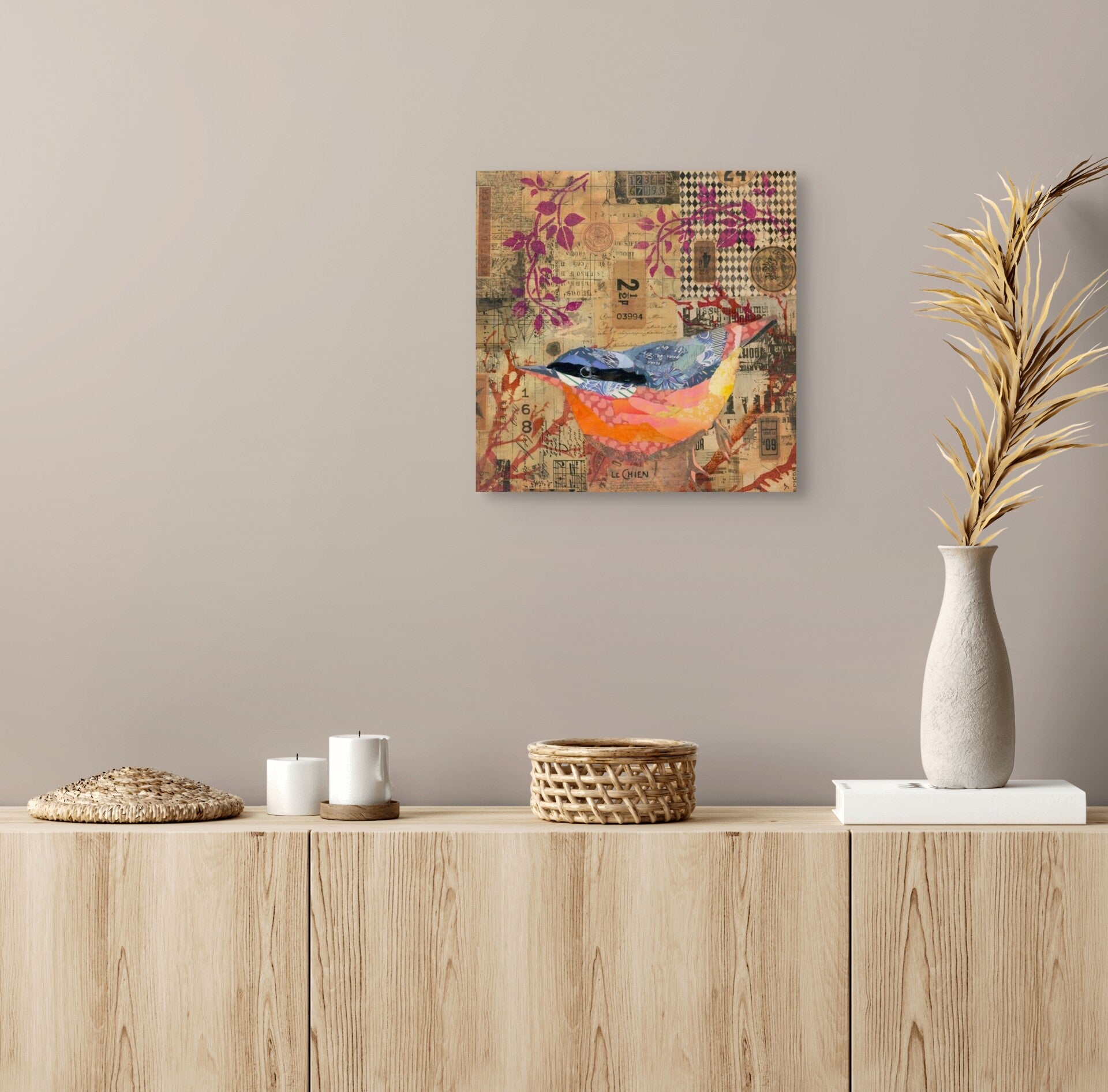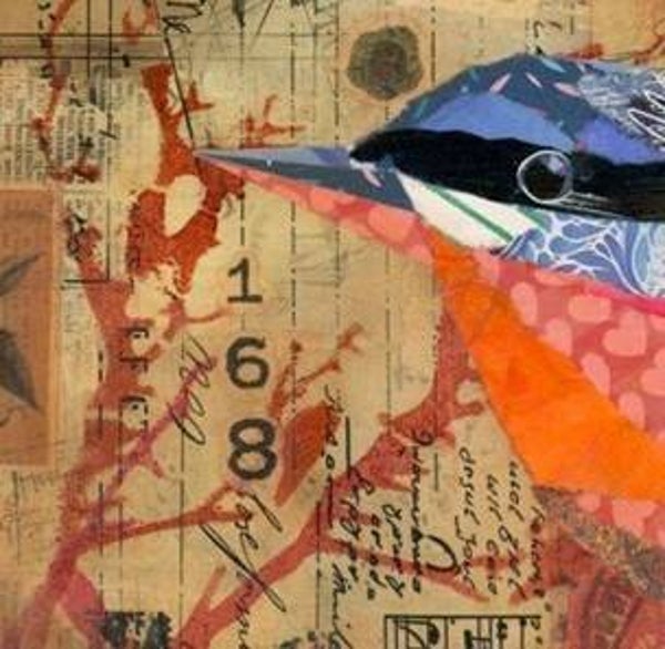 This collage presents a nimble nuthatch as both subject and storyteller, pieced together from vibrant fragments of colour and pattern. The bird’s body is constructed like a quilt — layers of blues and oranges — contrast beautifully with the muted, sepia-toned background of vintage ephemera, creating a sense that the bird has emerged from memory itself. Above and around it, magenta botanical forms stretch across the composition, adding a lively, almost whimsical energy that balances the aged textures beneath.