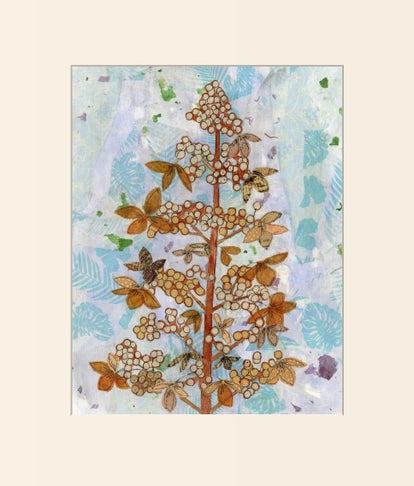 The original artwork is a collage on card depicting the seedheads of the hydrangea in shades of brown on a light blue background.