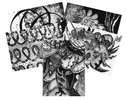 This pack contains 5 rectangular black and white 6 x 8 in (15 x 20 cm) prints of the following monochrome artwork by Alison Adams: Eccentric Loops, Rip Torn Flowers, Loops, Funky Flowers and Pendants.